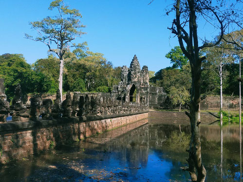 アンコール・トムというのは「大きな都」という意味です。12世紀後半に建てられ、一辺約3km、ほぼ正方形の形状で、クメール時代最大の都城であったとされています。アンコール・トム内部には、中心に巨大な観音菩薩がある事で知られるバイヨン寺院があり、その他、五つの大門やバプーオンなど見所も多数。